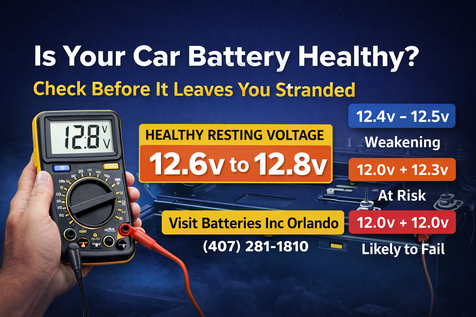 But voltage alone is not a complete health test. If you want a real answer, get the battery checked properly at Batteries Inc Orlando.